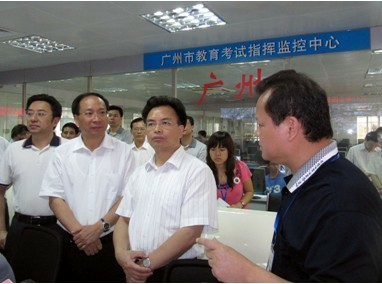 6月7日是全国高考的第一天,上午开考后,广东省副省长、广州市委副书记、市长万庆良等领导一行来到广州市招生考试委员会办公室的“广州市教育考试指挥监控中心”,通过由金鹏电子信息机器有限公司建设的“网上巡查系统”,察看了全市57个高考考场、1933个试室的考务现场实时情况,各考场、试室实时状态一览无遗。万市长一边察看,一边向市招考办吴强主任仔细询问了我市此次高考的考前准备和考试过程的管理工作,并特别关注考场监控的情况,询问了解了每个试室安装摄像头的数量。吴主任向万市长等相关领导详细介绍了相关情况,他表示市招考办积极响应国家教育部对高考考场的管理要求,今年已全面实现了监控中心对全市考场视频的集中监控和巡查,同时与省教育厅、国家教育部实现了实时互联互通,省教育厅与国家教育部可直接查看广州市任意试室的现场视频。万市长等领导对”网上巡查系统“在高考管理工作中发挥的重要作用表示了肯定和赞许。