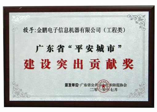 2010年7月7日,来自各地的公安、教育、监管、金融与安防行业各界人士在广州香格里拉大酒店欢聚一堂,对一批优秀的安防企业进行了表彰。金鹏电子信息机器有限公司获得广东省“平安城市”建设突出贡献奖这一重要奖项。这一殊荣充分表现了社会各界对金鹏在平安城市建设中所做出的优异成绩的高度肯定,同时奖项也将成为金鹏继续为用户提供高品质服务的巨大推动力。