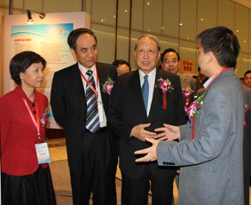 全国人大常委会原副委员长,著名经济学家成思危在工业和信息化部通信科技委副主任陈如明及金鹏电子信息机器有限公司总经理钟红梅,副总经理曹志雷的陪同下参观金鹏展示区