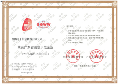 金鹏从2011年开始就荣获“广东省诚信示范企业”称号,此次再次荣获“2011年广东省诚信示范企业”殊荣,与金鹏一贯坚持倡导诚信经营和推进诚信体系建设是分不开的。金鹏一直坚持重合同守信用和努力构筑诚信价值的理念,积极承担社会责任,以良好的企业信誉和商业道德,赢得了客户的认可和各界合作伙伴的充分信赖。