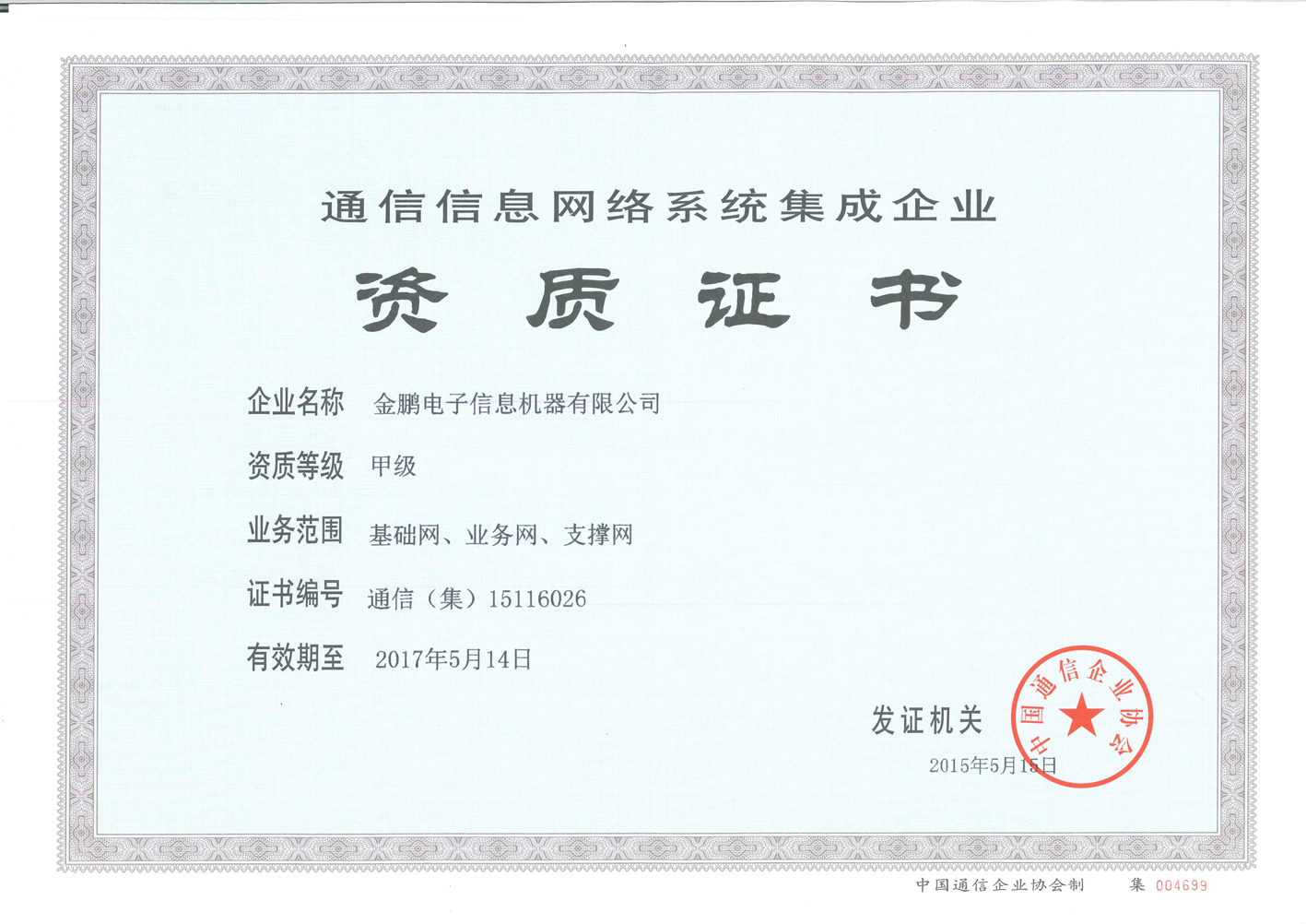 金鹏于2006年首次获得通信信息网络系统集成乙级资质,截止目前已做过两次续期。随着公司业务的不断发展,对该资质的要求也随之升级。甲级资质对申报企业的整体实力、专业人员、业绩、财务指标等评审条件要求较高,特别是对工程师、概预算和安全员等专业人员的资格审查和评审流程都非常严格。金鹏的各项硬指标均满足条件,顺利通过了专家的评审,并经广东省通信管理局审核获批该项甲级资质。