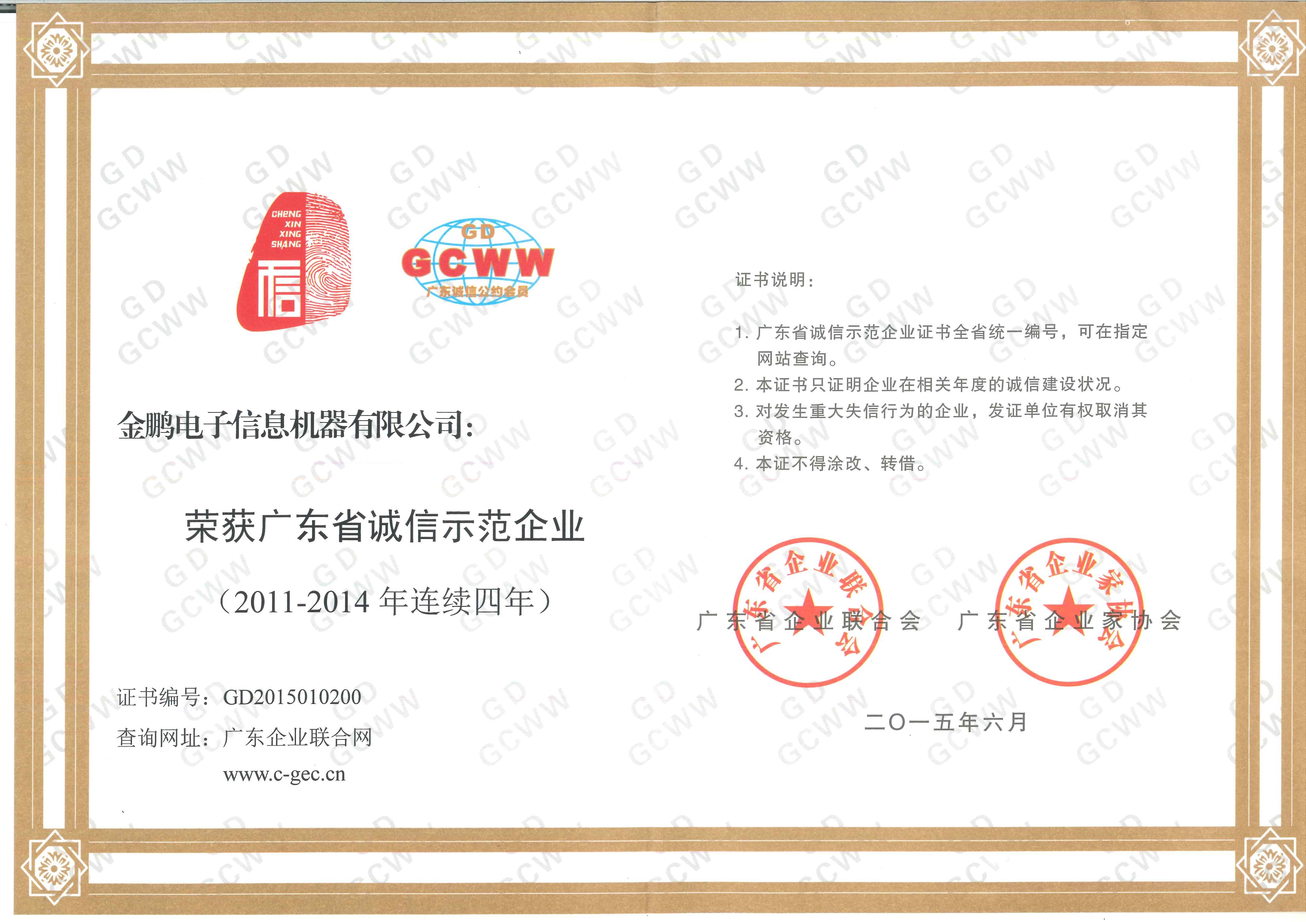 金鹏连续四年荣获“广东省诚信示范企业”称号,是多年来诚信经营、优良服务的最佳证明,也是社会各界对金鹏在履行社会责任、诚信守法等方面工作的肯定和鼓励。金鹏始终把诚信建设贯彻落实到企业的经营管理当中,坚持重合同守信用,努力构筑诚信价值理念,建设诚信企业文化,塑造诚信企业精神,积极承担社会责任,以良好的企业信誉和商业道德、优质的产品与服务,赢得了社会的高度认可和合作伙伴的充分信赖,树立了良好的企业形象。