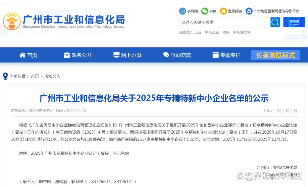 这一认定是对金鹏电子多年来坚持“专业化、精细化、特色化、新颖化”发展道路的充分肯定。作为一家成立30年的高新技术企业,金鹏自成立之初就把“创新、超卓、突破、引领”作为企业文化精神,金鹏始终通过持续的技术创新、管理创新和服务创新,不断超越自我,引领市场,连续多年研发经费投入超千万元,金鹏电子是广东省首批获得国家高新技术企业称号,并连续16年保持该荣誉的企业。同时金鹏还获得广州市创新标杆企业、广东省创新型中小企业、广州市人工智能企业、广州黄埔区&广州开发区信息技术应用创新企业等荣誉称号。多年来,公司始终将技术创新嵌入发展基因,近年来聚焦智慧城市安全、智慧城市应急、智慧低空安全等细分赛道,深耕公安、城管、交通、电力、医疗等行业应用场景,先后攻克推出了一系列具有自主知识产权的特色产品。此次复核通过,不仅是对公司过往“专精特新”实践的权威背书,更为公司后续发展注入了政策动力。展望未来,金鹏电子将以此次复核通过为新起点,继续深化“专精特新”发展理念,重点布局人工智能、边缘计算、物联网感知等前沿技术,推动产品向高端化、智能化、定制化升级。‘专精特新’不是终点,而是公司持续发展的方向。未来金鹏将继续聚焦核心业务,深耕特色领域,用技术创新驱动企业发展,为广东省‘专精特新’企业群体的壮大贡献自己的力量,为推动行业数字化转型提供更多‘金鹏方案’。”公示了2025年专精特新中小企业认定(复核)通过企业名单。经过专家严格评审和综合评估,金鹏电子信息机器有限公司顺利通过2025年度复核,再度荣获