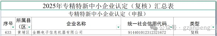 近日,广州市工业和信息化局近日,广州市工业和信息化局公示了2025年专精特新中小企业认定(复核)通过企业名单。经过专家严格评审和综合评估,金鹏电子信息机器有限公司顺利通过2025年度复核,再度荣获广东省“专精特新”中小企业认定。